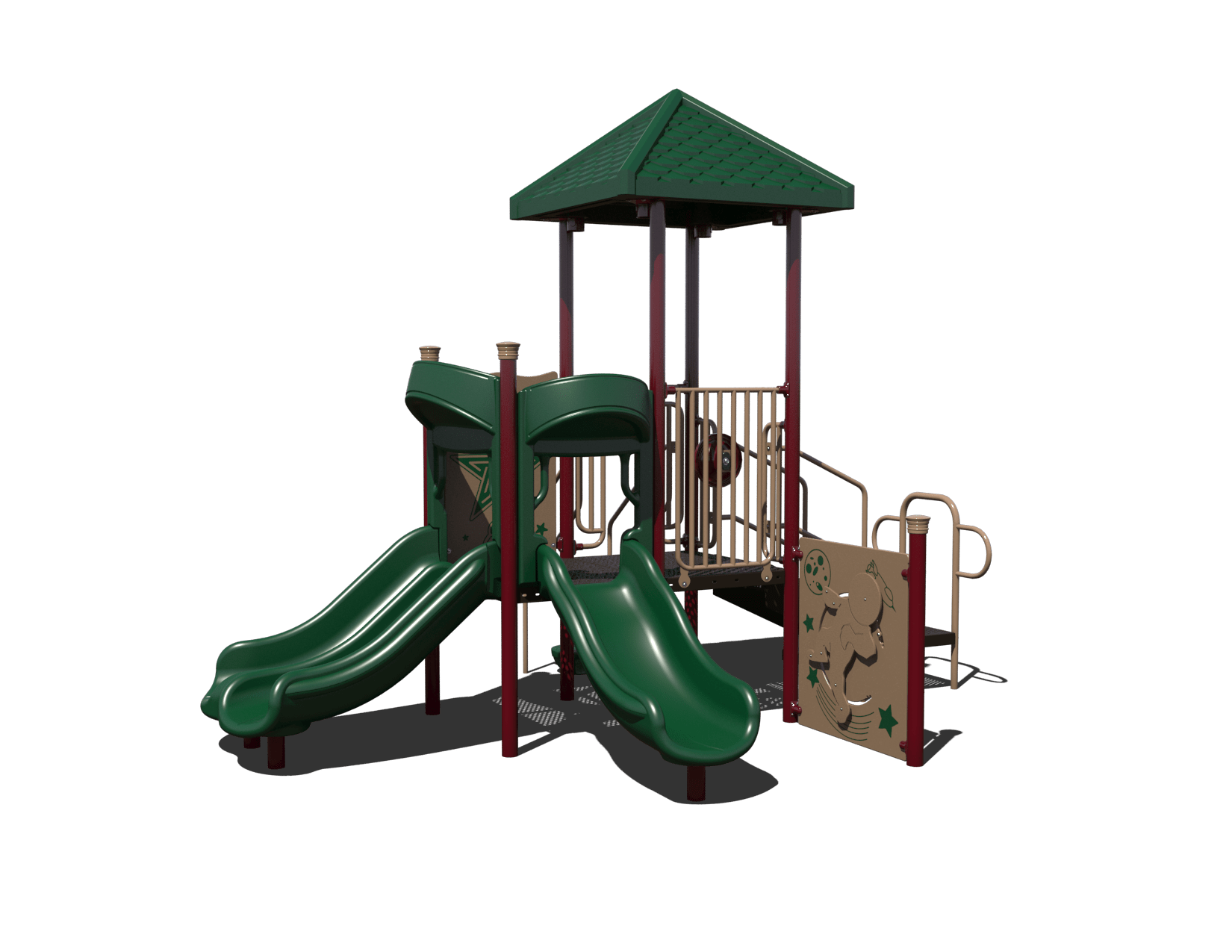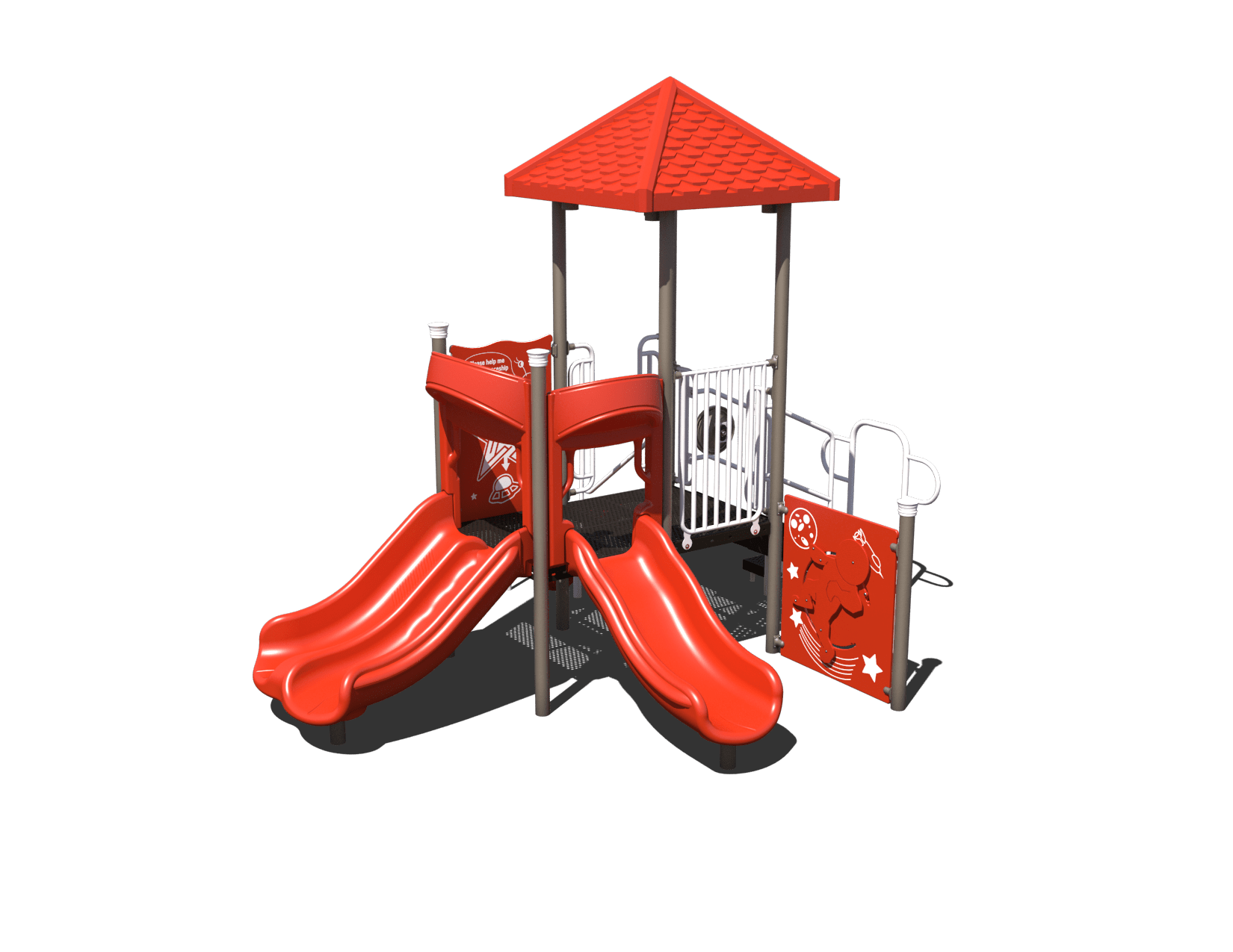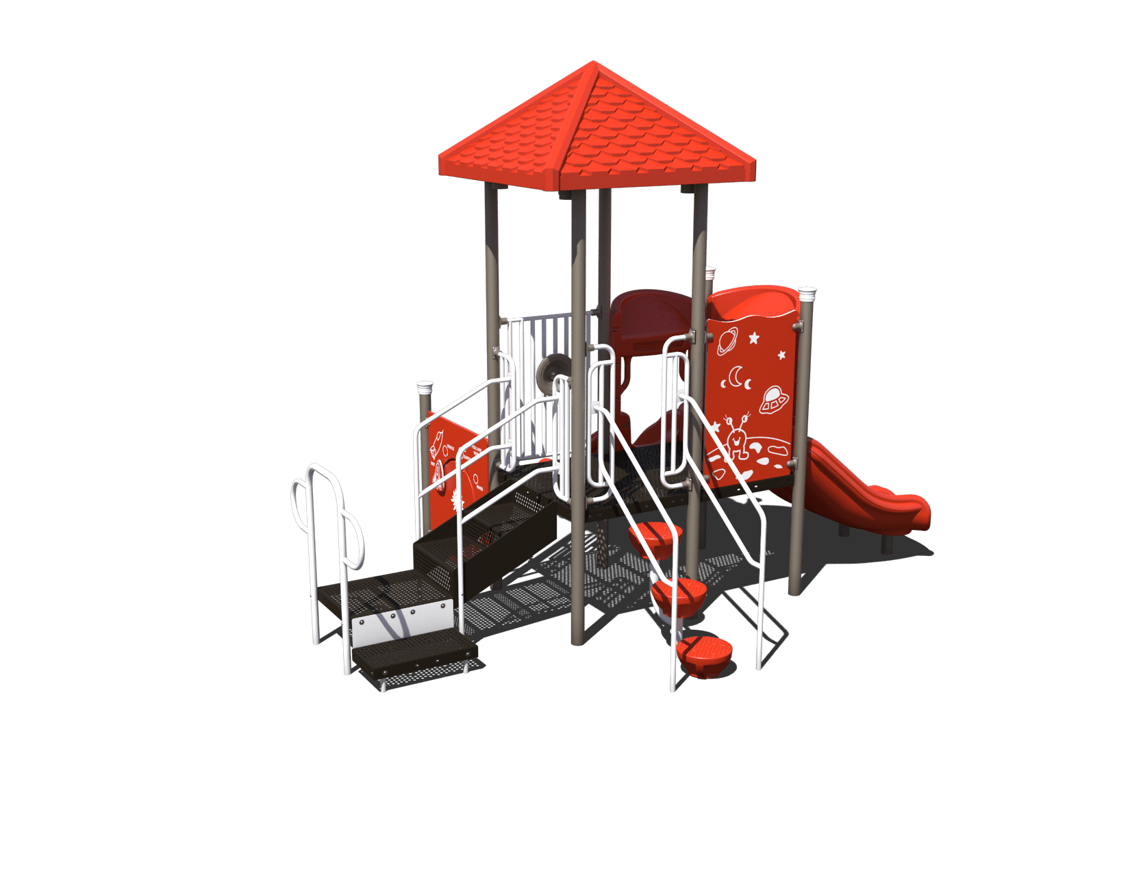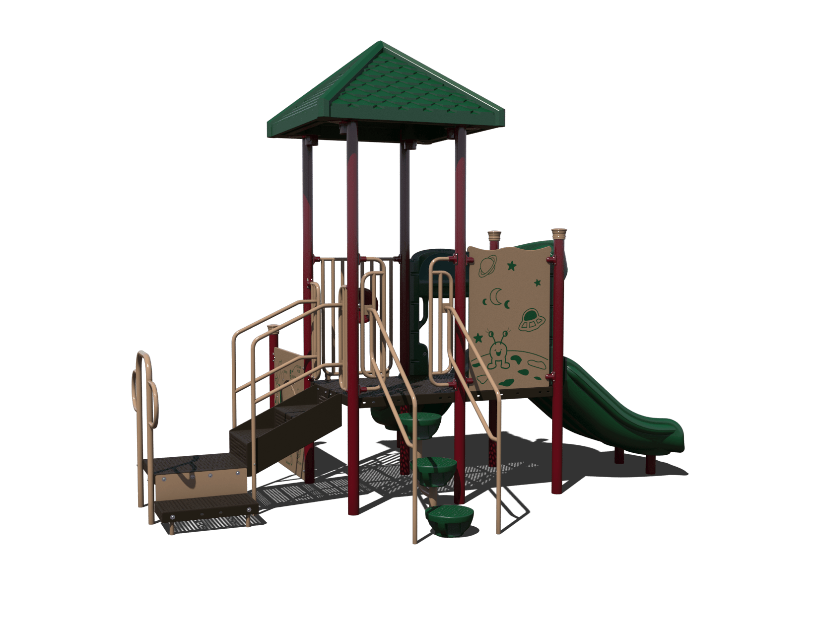 Beyond Infinity Playground is perfect for any child looking for a fun and exciting outdoor play experience. This playground features a straight double slide, lily pad climber with handrails, alien maze panel, straight slide, pipe wall with wheel, solar system panel, square shingle roof, and ADA transfer station. With plenty of activities to keep children entertained for hours on end, Beyond Infinity Playground is sure to be a hit at your church, park, school, or camp!