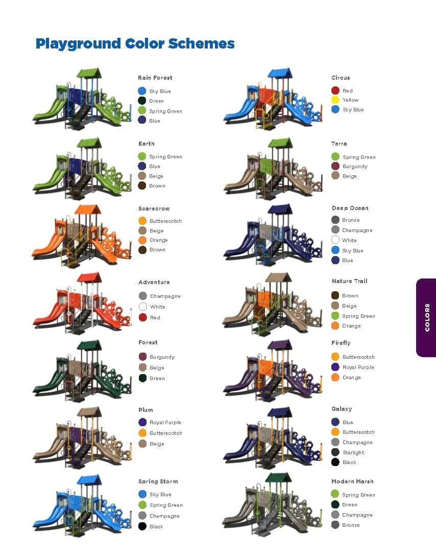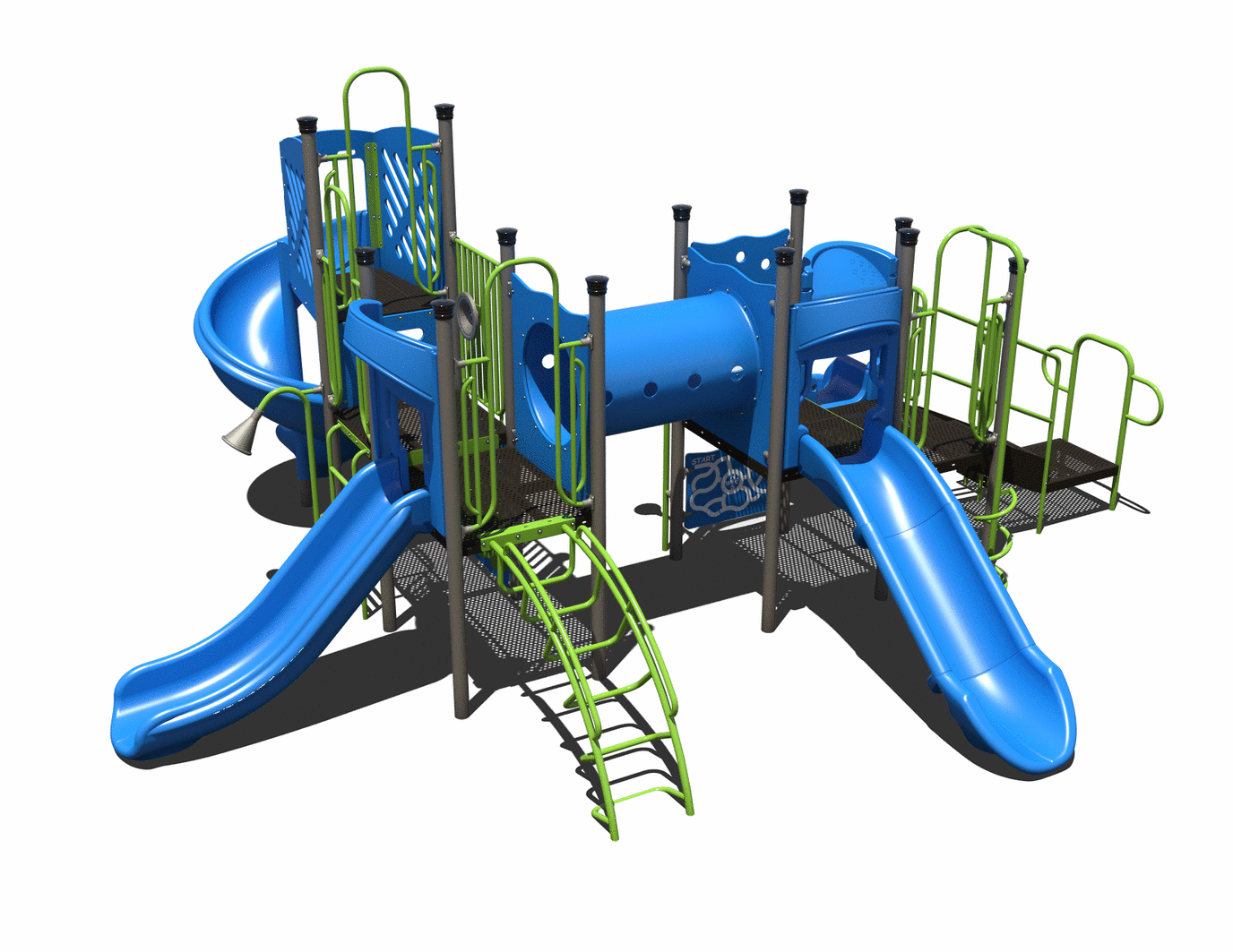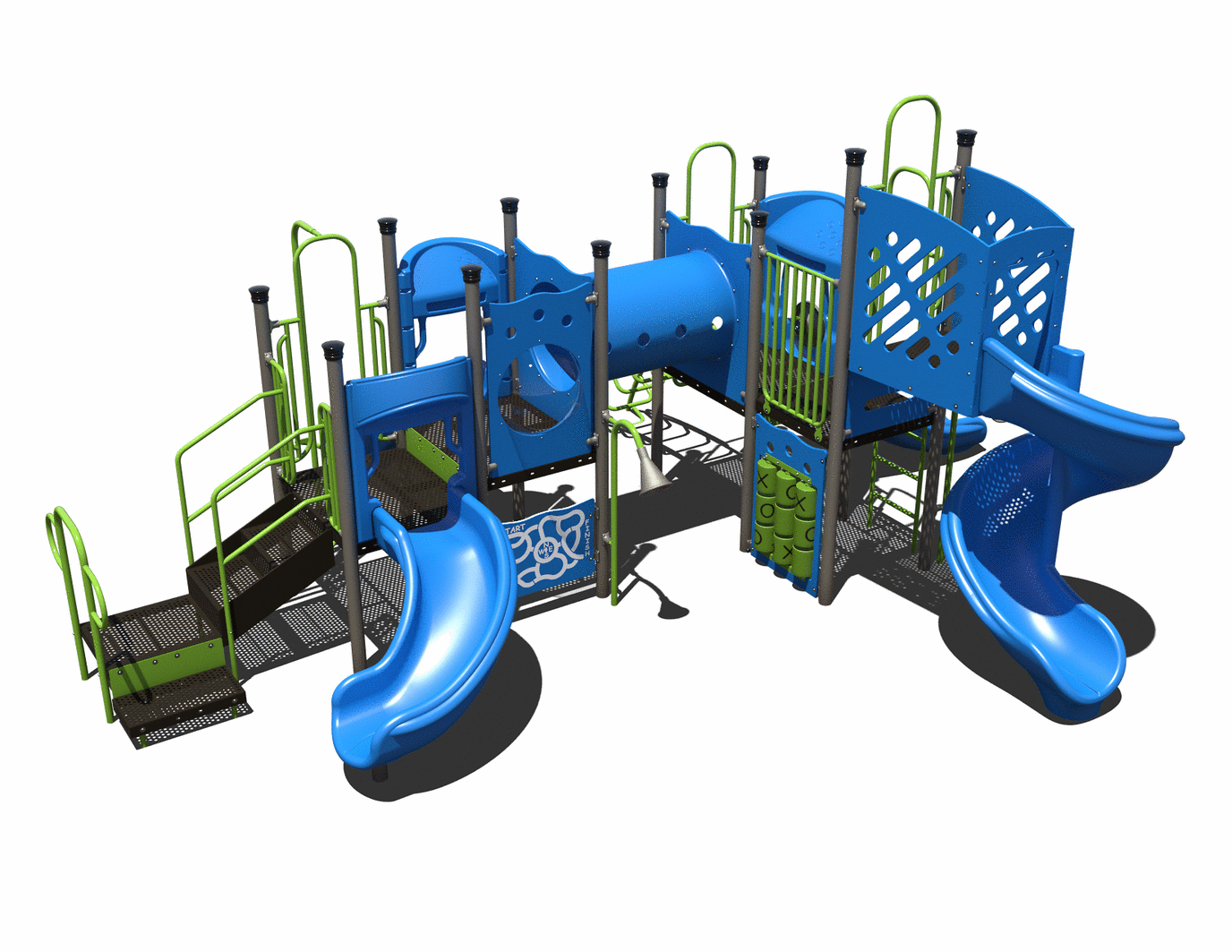 The Blue Ridge Adventure playground invites kids to climb, crawl, and slide their way through a world of fun. With vibrant blue slides, a twisting tunnel, and bright green climbing features, it’s built for endless exploration. Children can challenge themselves on multiple entry points, zip down the curving and straight slides, and navigate elevated platforms for a mix of excitement and imaginative play. Whether they’re racing friends or creating make-believe adventures, this playground keeps the energy high and the smiles wide.