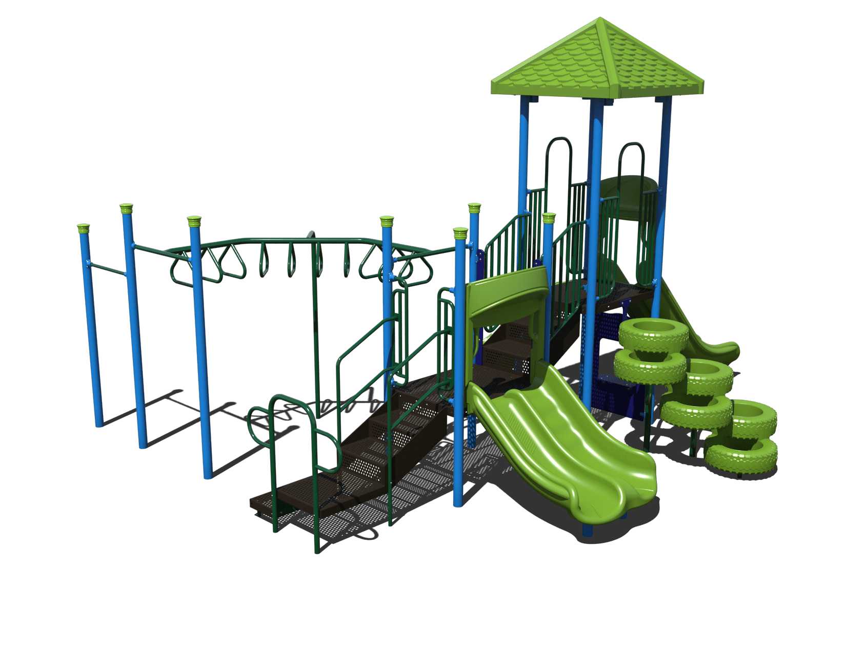 The Dragon’s Den Playground is a fun, safe playground for children of all ages. Featuring a straight slide, store front panel, tire climber, square shingle roof, education climber, 24 inch transition stair unit, straight double slide, ADA transfer station and chin bar, the Dragon’s Den Playground is perfect for any park, school, church, or camp.