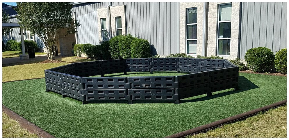 This modular GaGa Ball Pit provides years of exercise and fun to your students. This kit includes twelve 48"W border panels that interlock to create a 15-foot pit. It features an ADA compliant door so everyone can join in on the fun! The door swings open on one heavy-duty caster, and locks in place with a hook-style latch. The durable recycled plastic panels can be used both indoors and out. Steel stanchions keep the panels raised 4" off the ground making it easy to clean. The pit can be permanently anchored outside if desired.