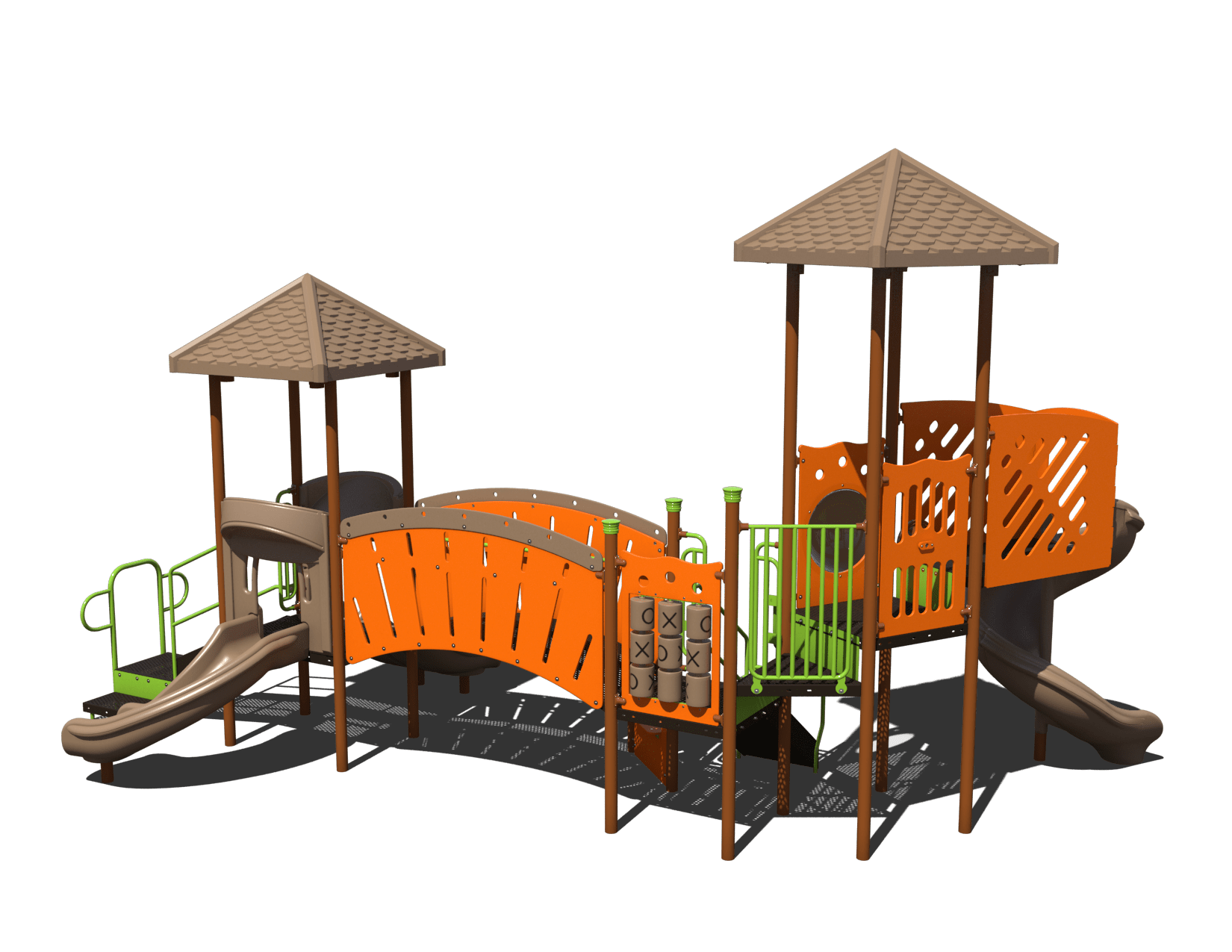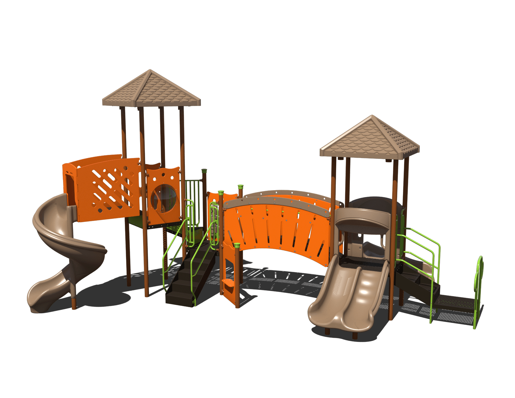 Introducing the On Top of the World Playground, perfect for hours of fun-filled play! This children's playground features a beautiful open spiral slide, bubble panel, two square shingle roofs, driving panel, pipe wall, tic-tac-toe panel, stair unit, store front panel, arched bridge and more. Plus there's even an ADA transfer station to make it easy for everyone to enjoy. So bring the On Top of the World Playground to your church, camp, school, or park today and let the good times roll!