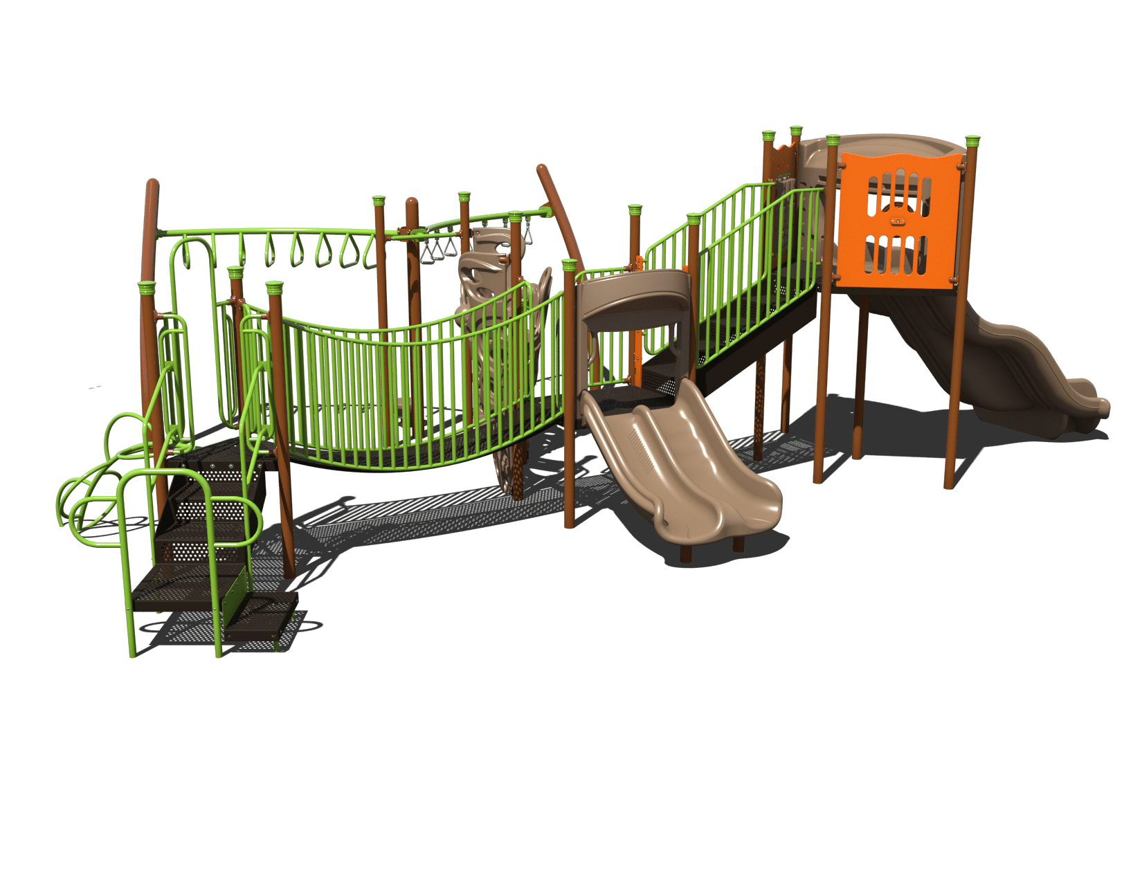 Introducing the Scallywag Island playground - a fun and exciting children's playground that is perfect for all ages! With a triple rail slide, suspension bridge, ADA transfer station, half moon climber, curved tri-rung ladder, single lily pad seat, 3-way connector, transition end connector, half gate, tic-tac-toe panel, bubble wall climber and 36 inch transition stair unit with gates - there is something for everyone to enjoy! It is the perfect addition to your school, camp, church, or park. So come on over and have some fun!